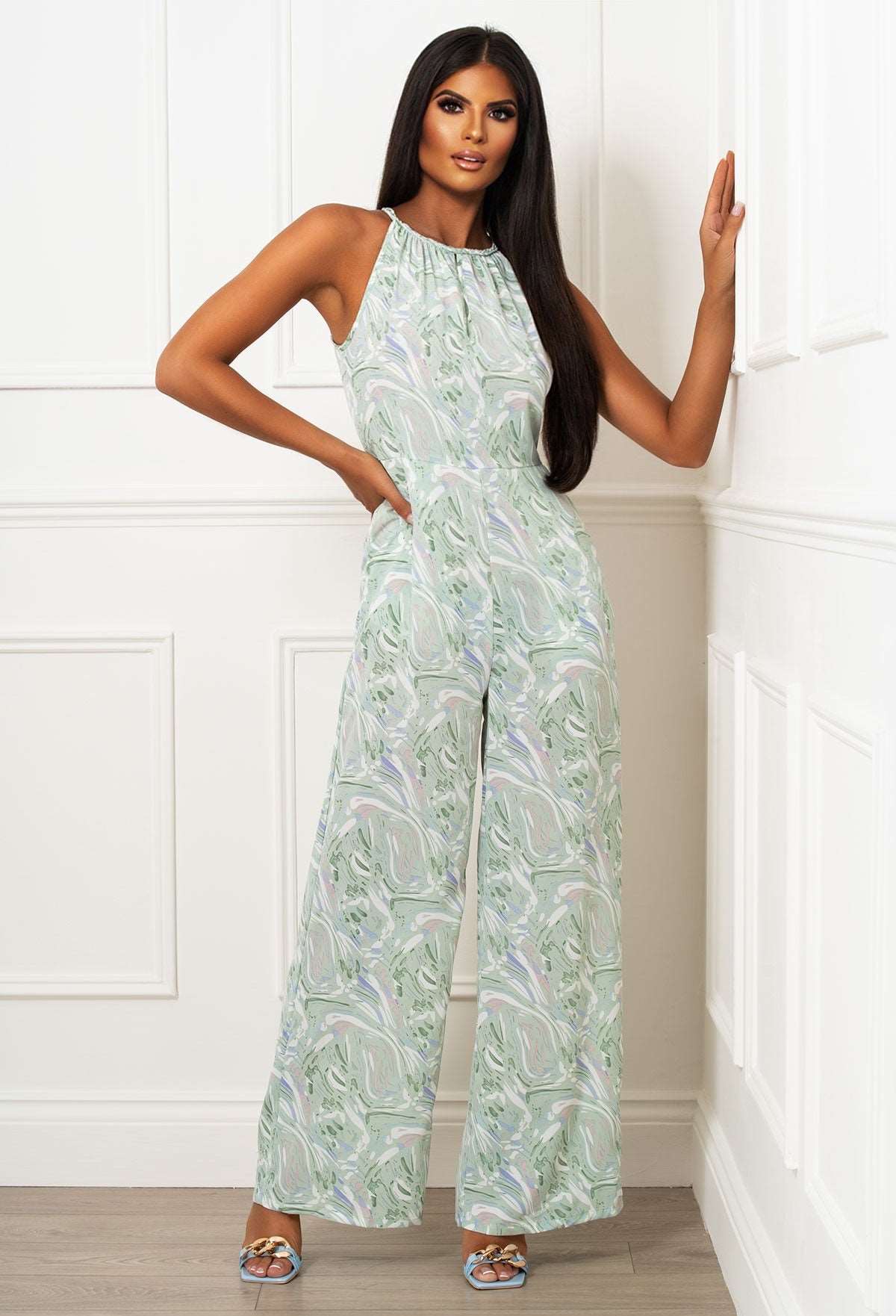 Pleated Perfection Green Marble Print Pleated Tie Waist Dress