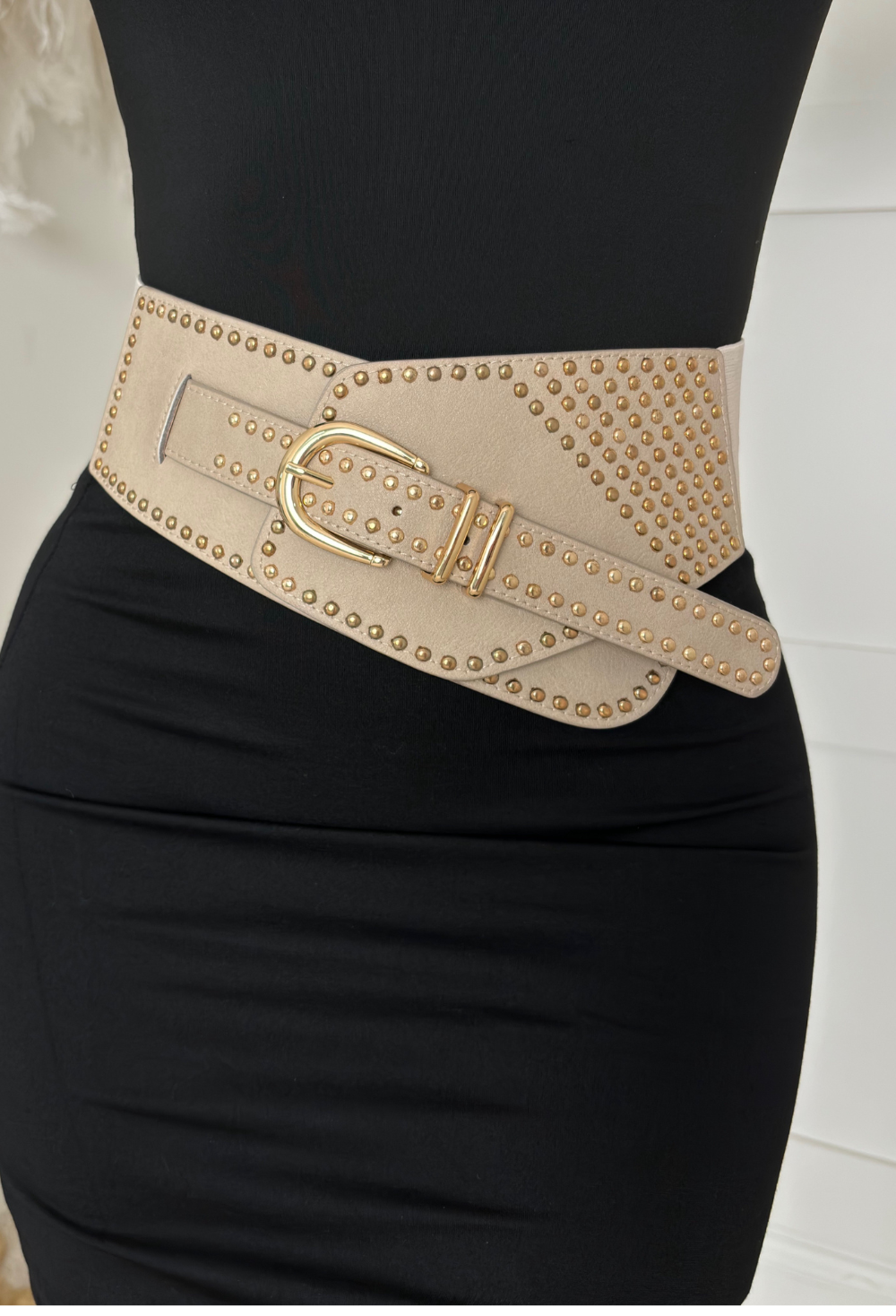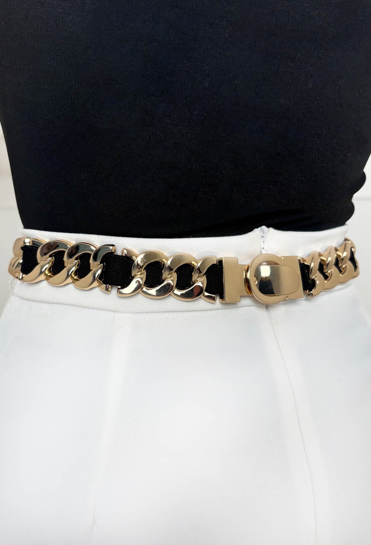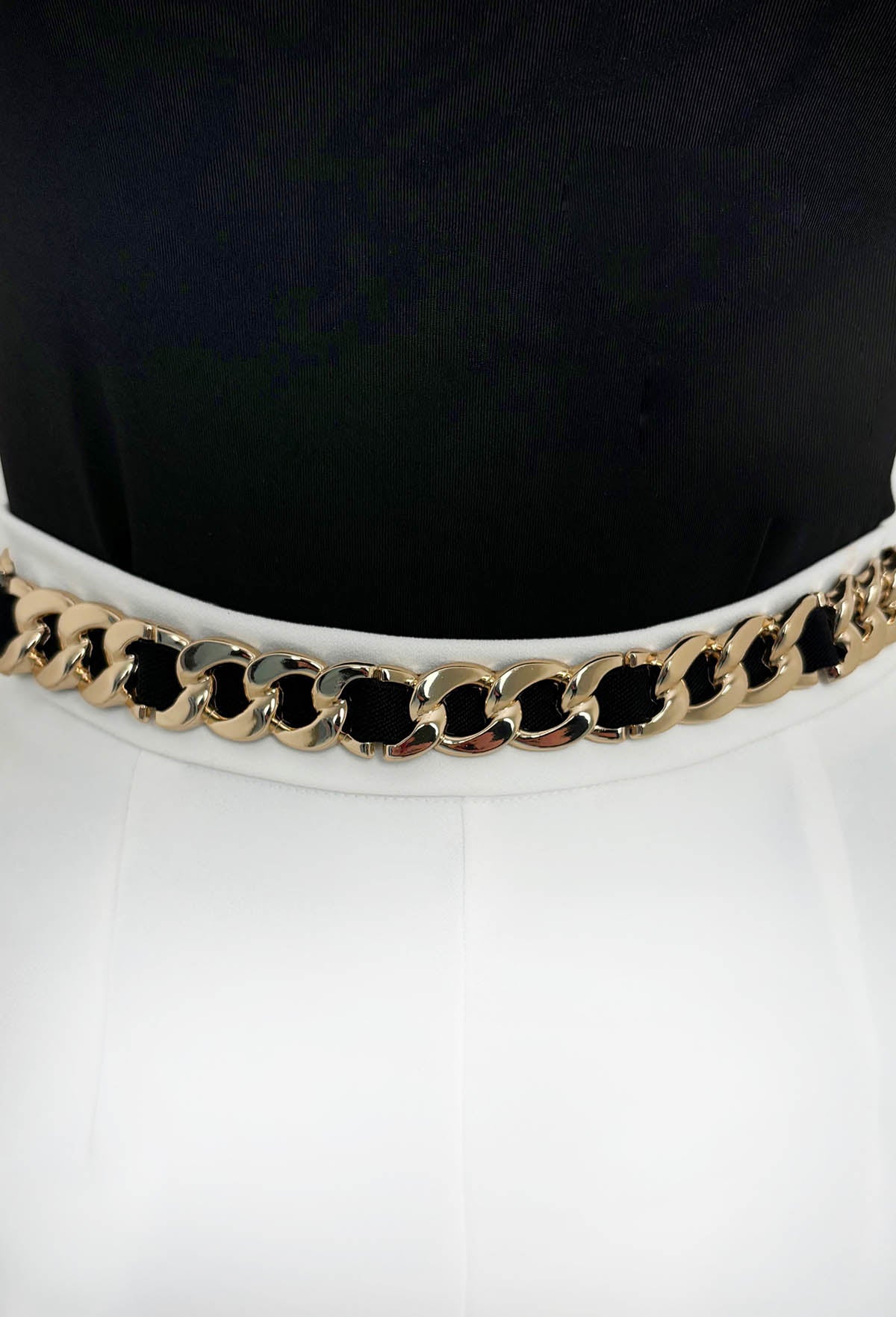 Linked Illusion Taupe Faux Leather Buckle Belt Midi Skirt