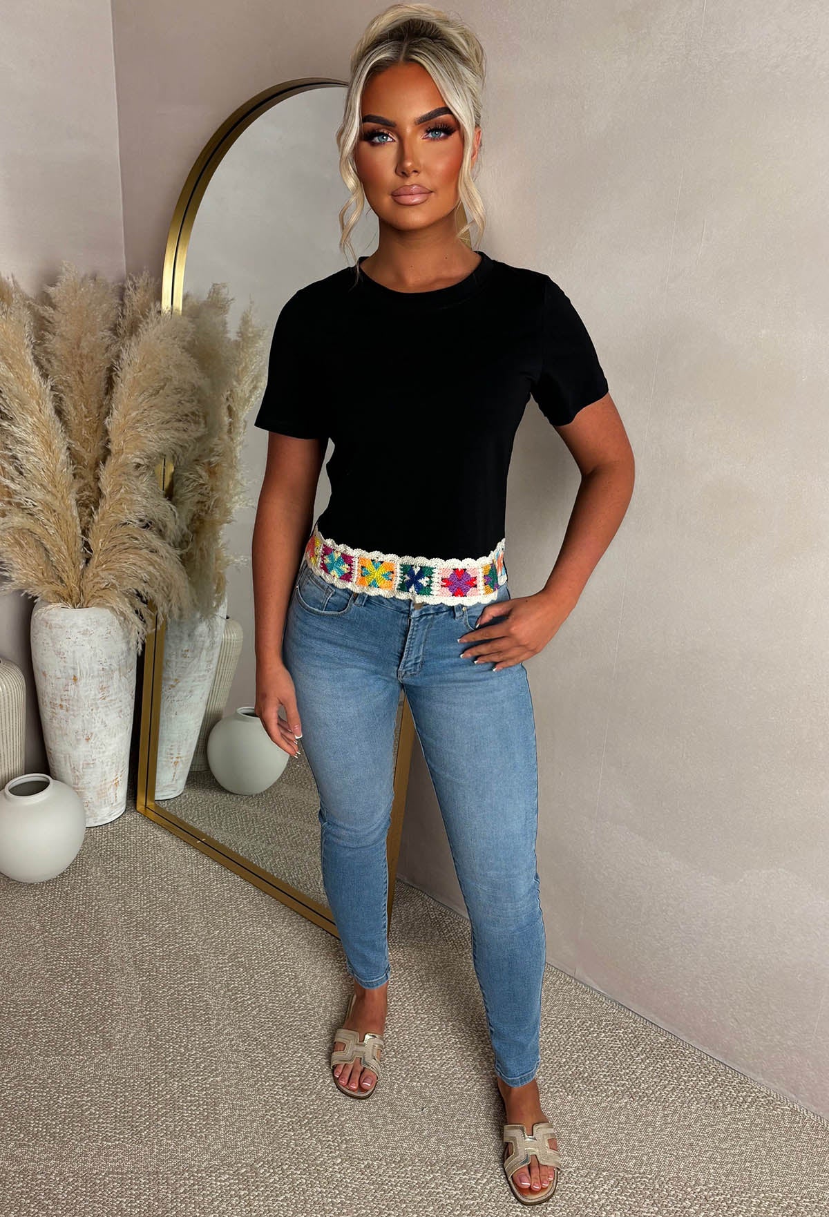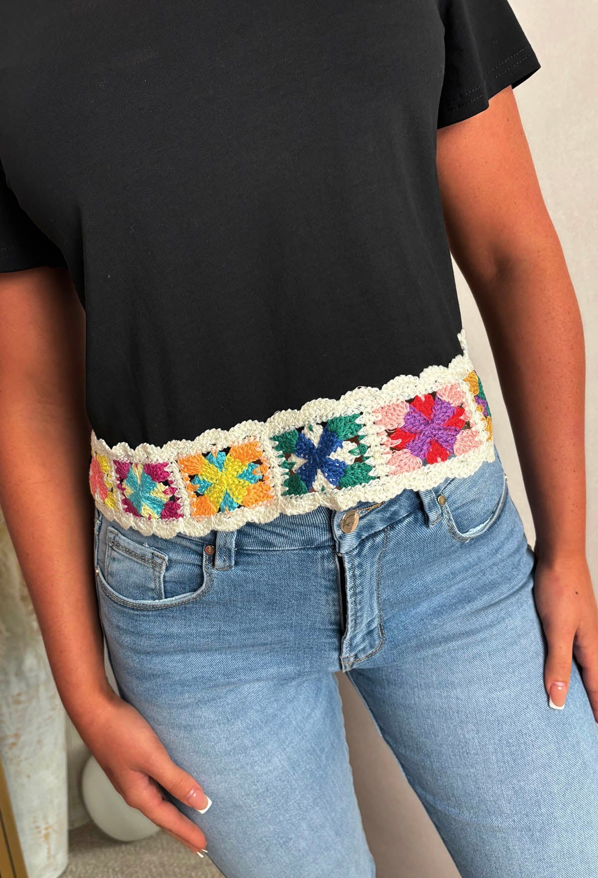 Add some fun to your wardrobe with our Always Daydreaming Black Crochet Hem T-Shirt! This playful cropped shirt boasts a colourful crochet hem design, perfect for your summer adventures. Stay stylish and comfortable all day long!