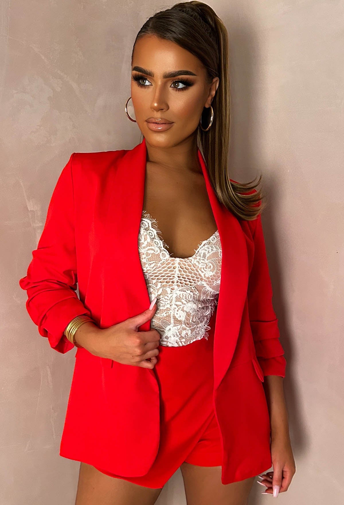 Take your style to the next level in this beaut red shawl ruched sleeve blazer! This super comfy blazer is perfect for dressing up or down!