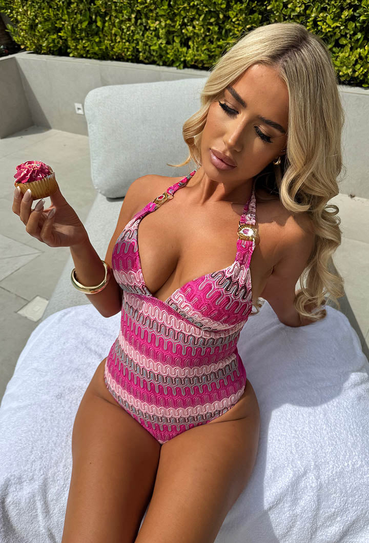Get ready to make a statement at the beach with our Antibes Pink Zig Zag Striped Deep Plunge Belted Swimsuit. Featuring a halterneck design and a plunging neckline, this swimsuit will accentuate your curves and give you a confident and stylish look. The playful aztec style zig zag print adds a touch of quirkiness to this must-have piece!