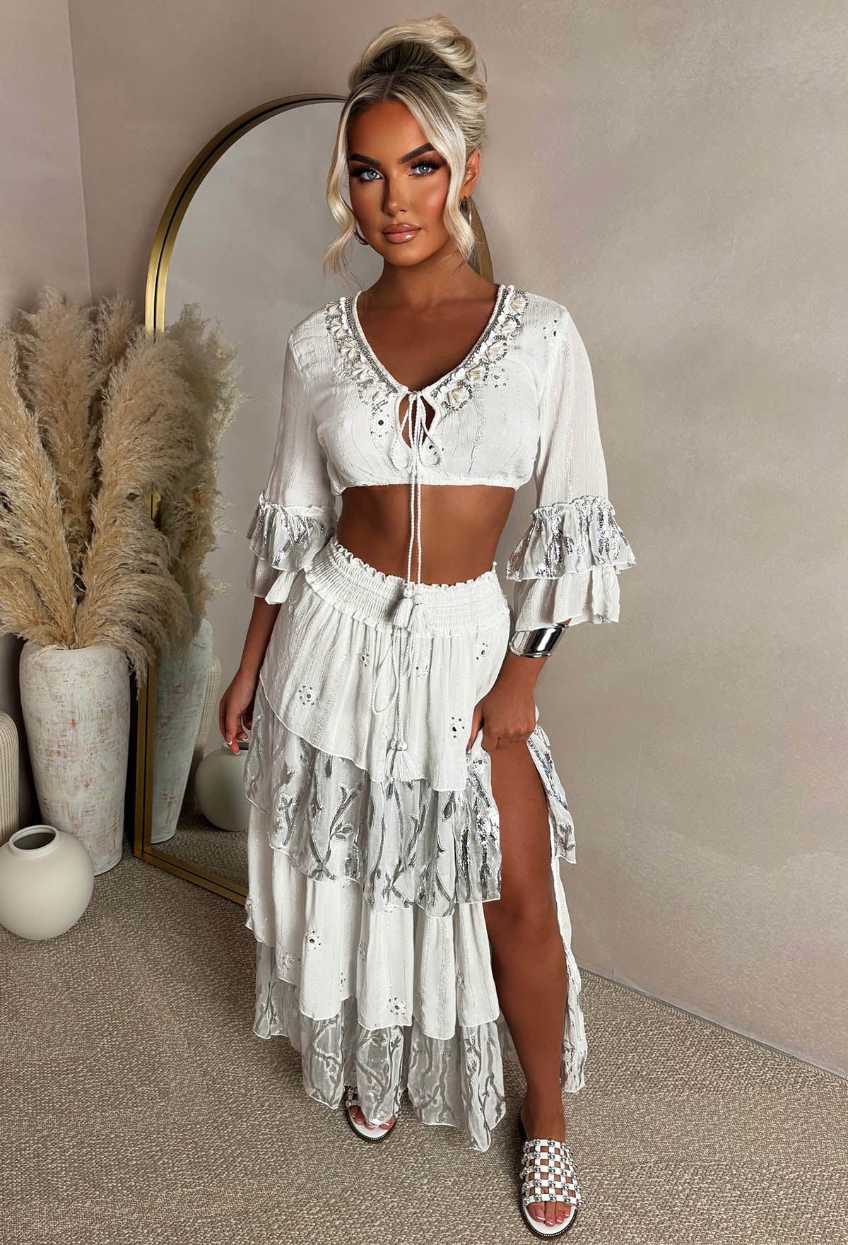 Take your outfit to the tropics with our Bahama Breeze White Embroidered Boho Maxi Skirt Co-Ord. This set includes a tie crop top with stunning embroidery and flirty frills, complete with a matching split tierred maxi skirt with silver foil details. It's perfect for unleashing your carefree side and embracing playful summertime vibes!