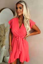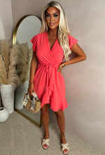 Best Believe It Coral Wrap Front Frill Sleeve Mini Dress