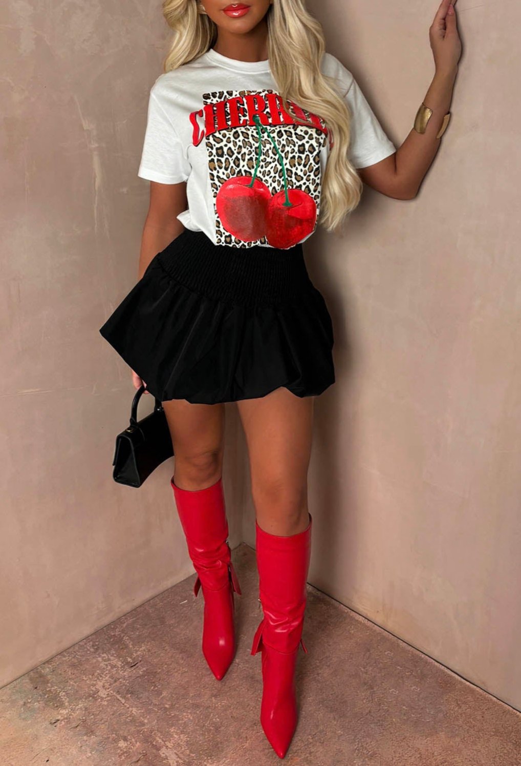 Get ready to turn heads with our Chic & Fancy Black Puff Ball Stretch Skirt! The unique puff ball bubble hem adds a playful touch while the stretch shirred waist band provides a comfortable fit. Perfect for a night out or a fun daytime look!
