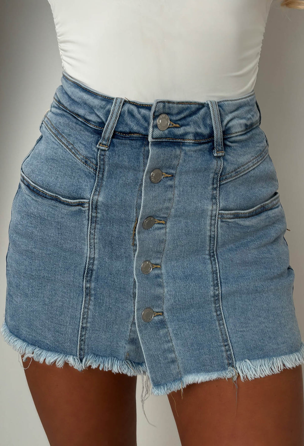 I'm That Girl Light Wash Denim Stretch Button Front Skort