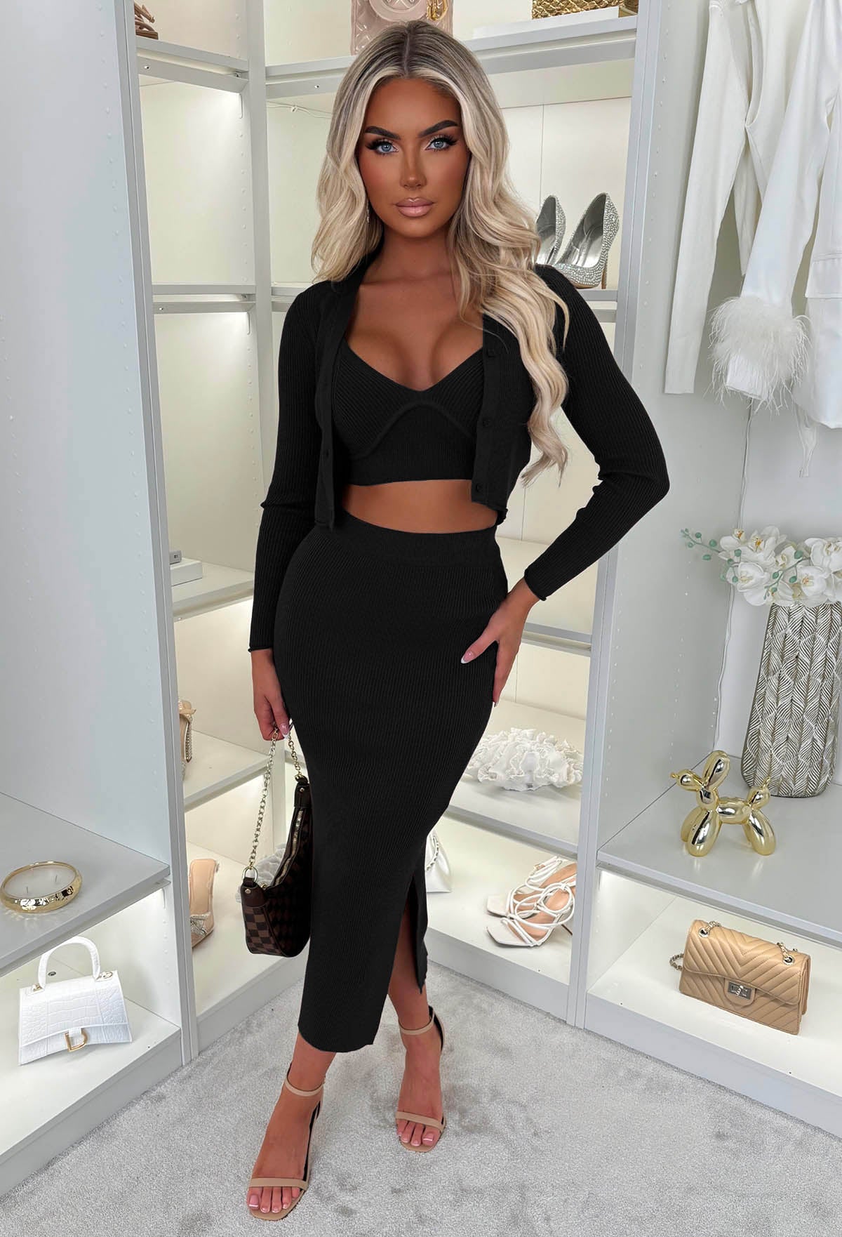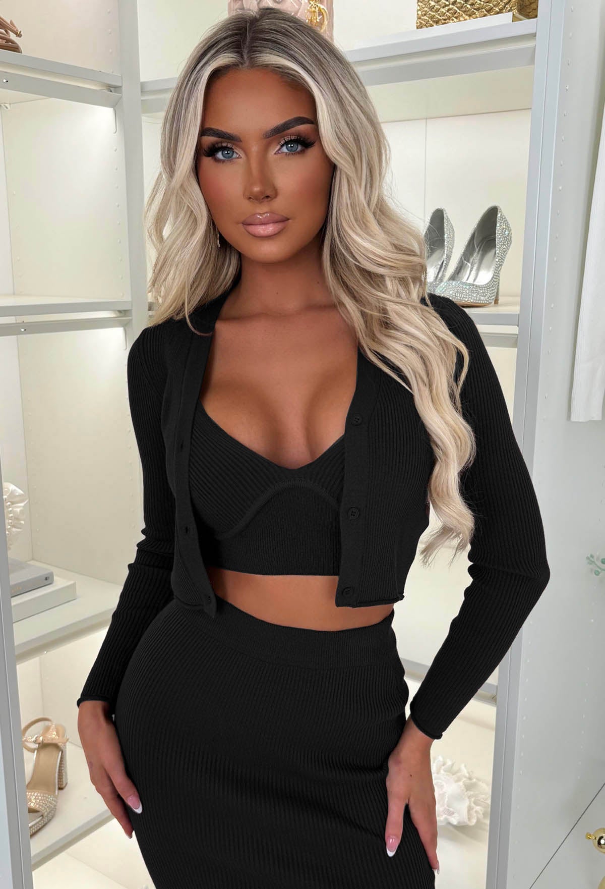 Unleash your playful side with the Kendra Black 3 Piece Knitted Set! Made from a stretchy ribbed knit fabric, this set offers versatile style with a button up cardigan and matching bralet and midi skirt. Whether for a casual day or a night out, stay comfortable and chic with this must-have set!