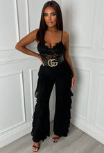 Unleash your inner diva with these Luxe Divine Black Ruffle Stretch Trousers. The wide leg design adds a touch of drama, while the stretch material ensures comfort and flexibility. The ruffle detail adds a playful flair to your look. Perfect for a flirty date night look or night out!