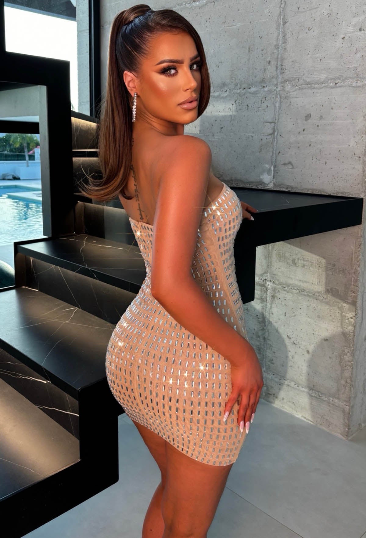 Turn heads in the Midnight Mirage Beige Bandeau Dress, sparkling with mirror hot fix embellishments that catch every light. This mini dress combines a sleek silhouette with dazzling details, perfect for nights when you want to shine and play. Effortlessly chic and fun, it’s your go-to for making a memorable entrance!