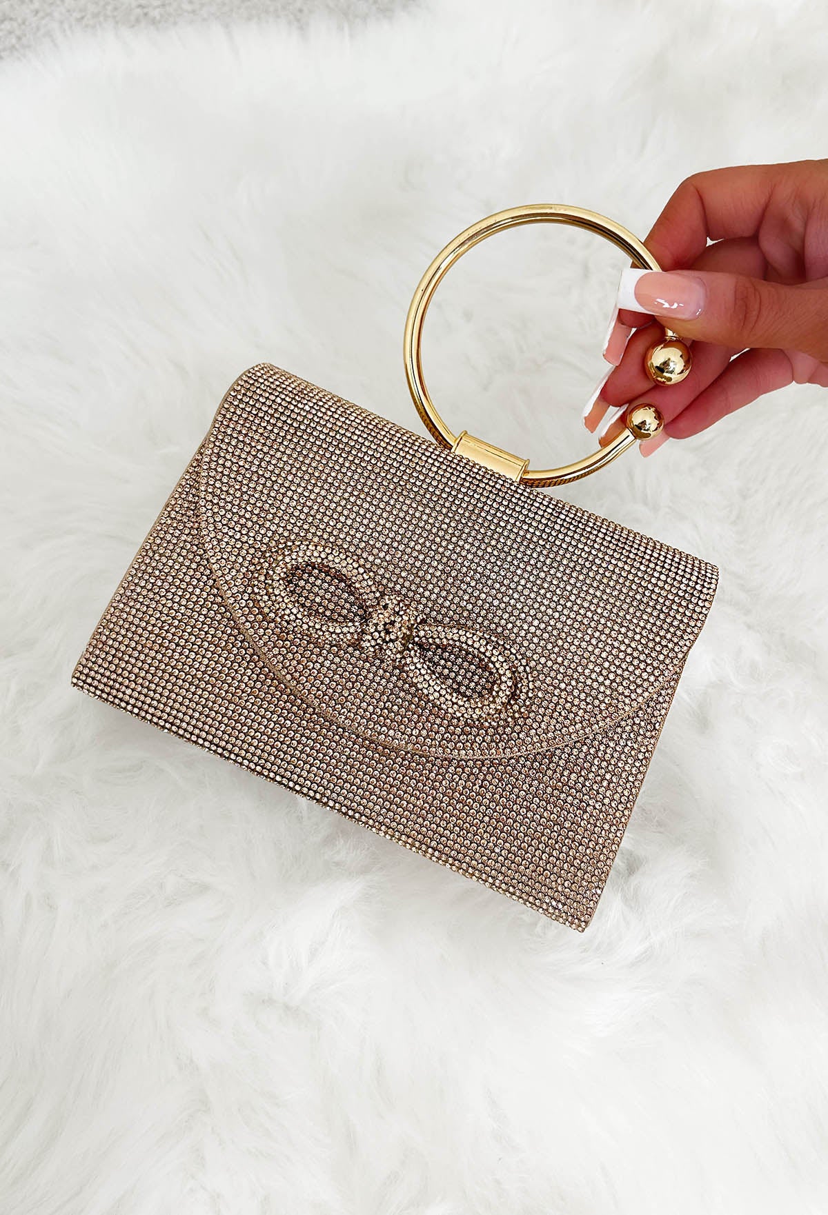 Add some sparkle to your wardrobe with our Run The World Rose Gold Diamante Detail Bag! With stunning diamante embellishments, a chic gold ring handle, finished with a cute bow detail, this bag is sure to turn heads. Perfect for a special occasion or adding a glam touch to your everyday outfit!