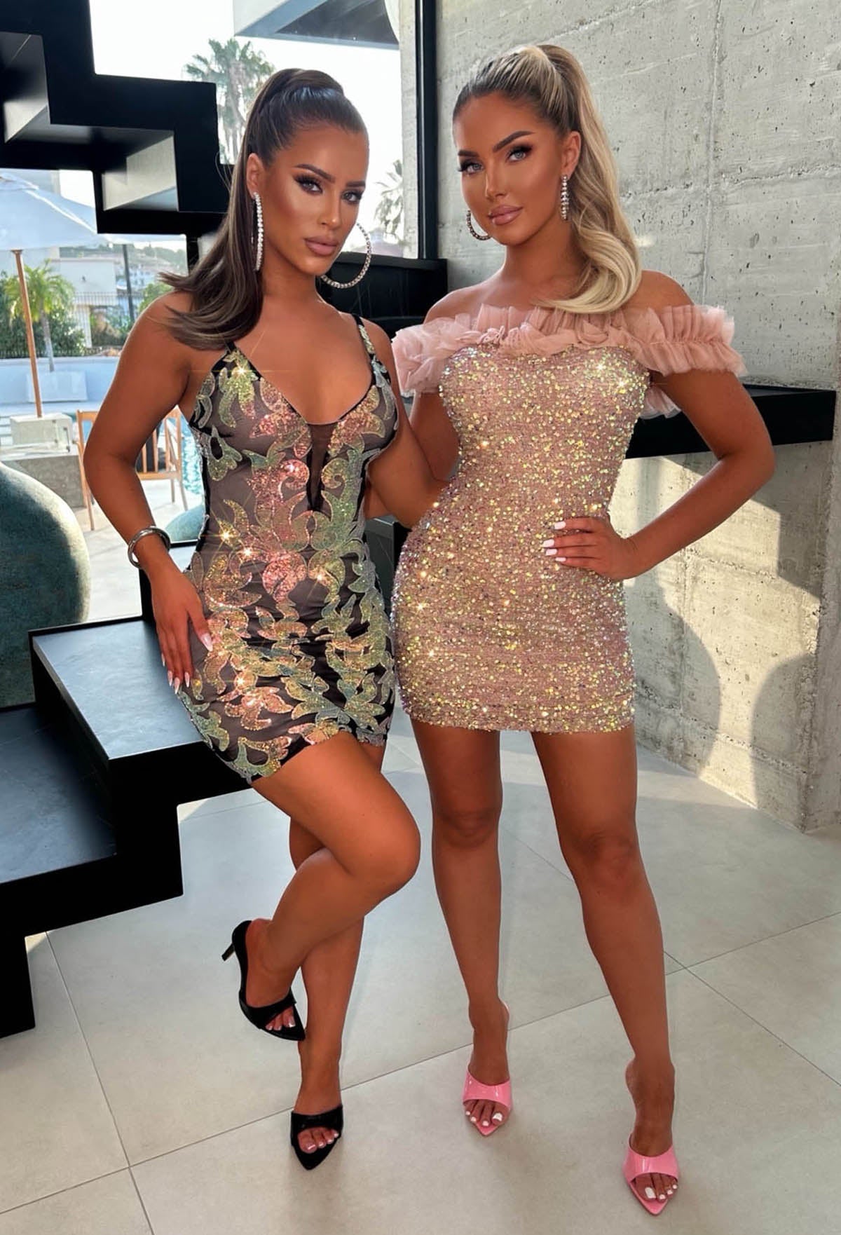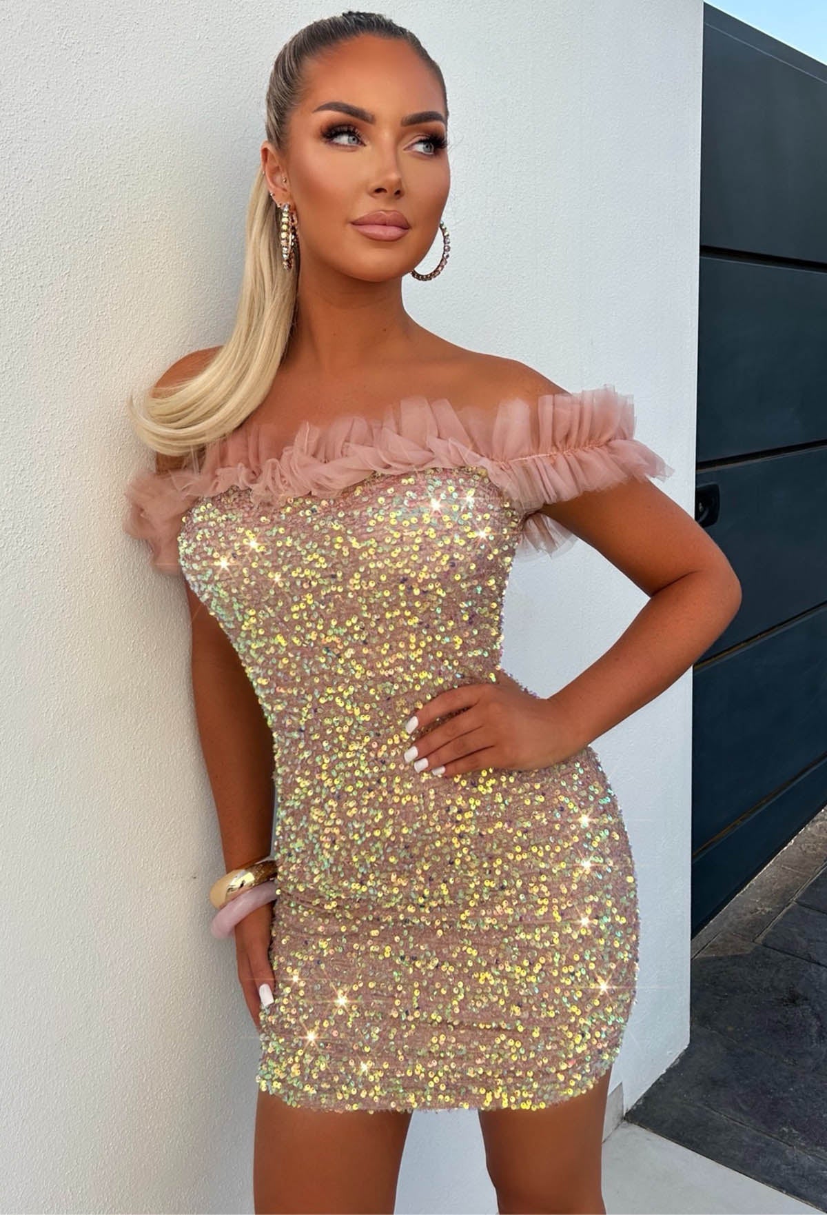 Get ready to sparkle in this Shimmer Season Mauve Sequin Ruffle Detail Mini Dress! In a shimmering sequin embellished design that catches every light, with a ruffle-trimmed bardot neckline adds flirty charm, while padded cups provide a perfect fit. Easy zip fastening ensures comfort, making it your go-to for unforgettable nights out.