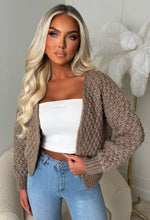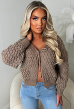 Stay cosy and stylish with our Sophia Mocha Chunky Knit Cardigan! Made with an ultra soft chunky knit fabric, this cardigan features a unique bobble effect and a tie-up front for a versatile and trendy look. Perfect for layering on chilly days and everyday wear.