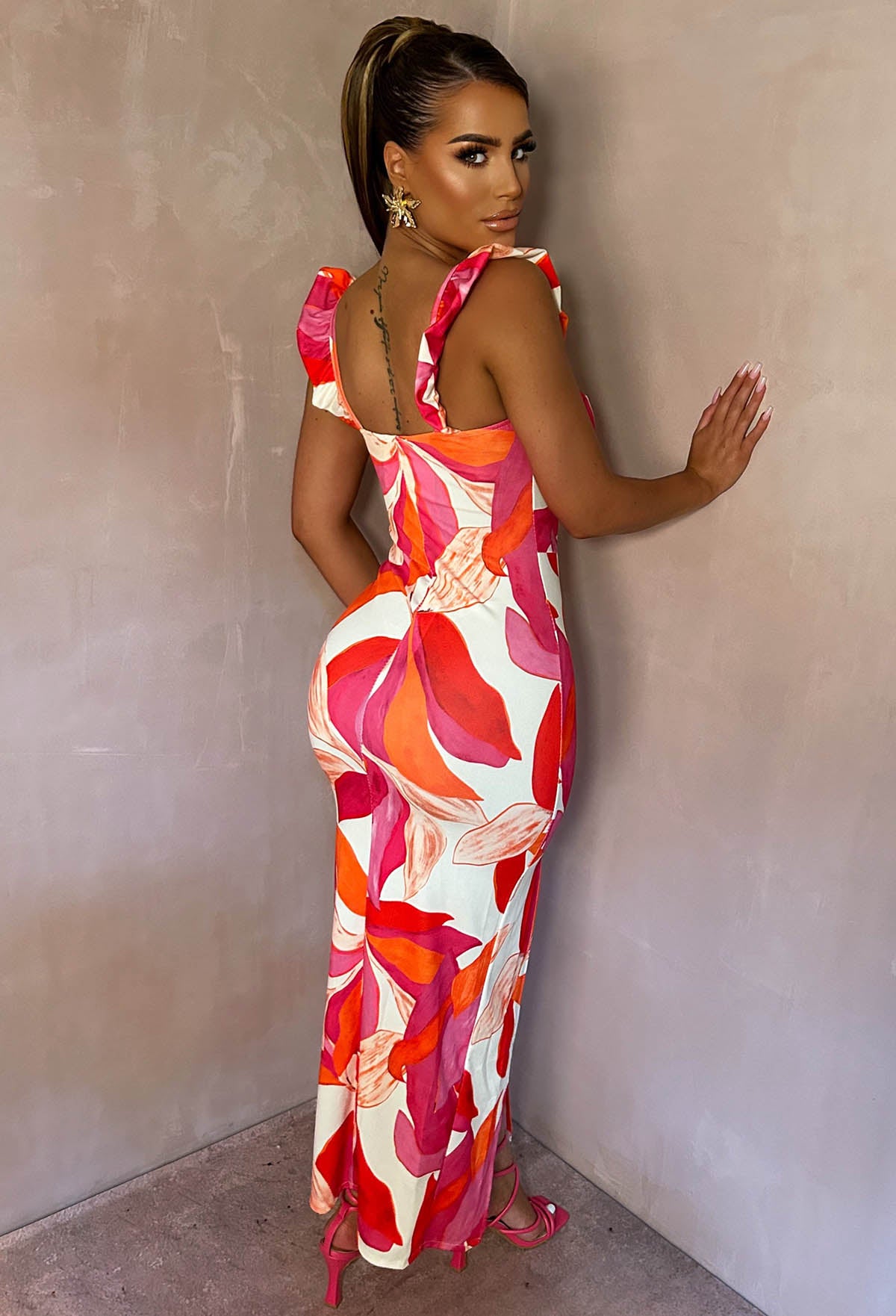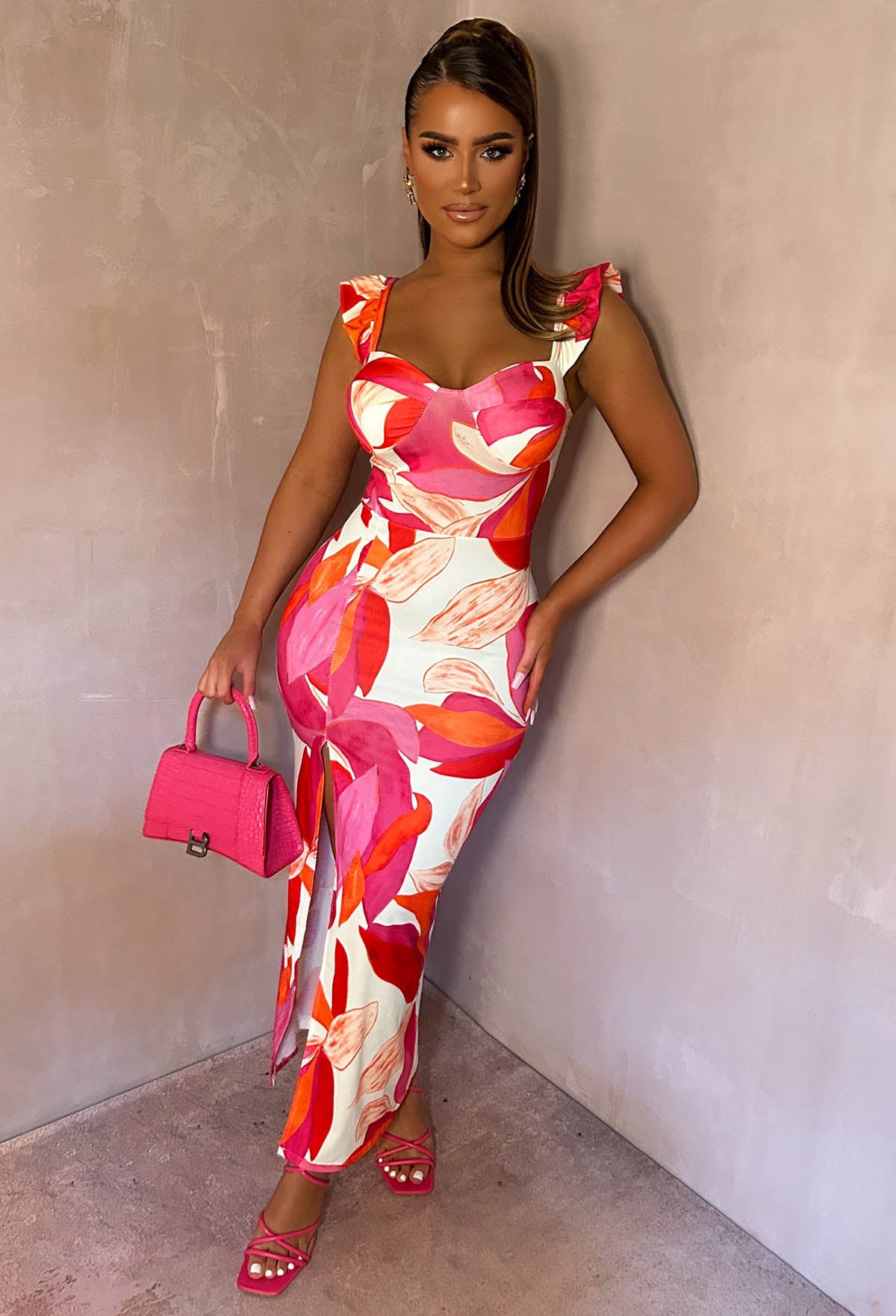 Get ready to turn heads with our Sunset Beauty Pink Printed Ruffle Sleeve Leg Split Midi Dress! Featuring a vibrant print and playful ruffle sleeve detail with padded cups for extra support, this dress will add a touch of fun to any occasion. Plus, the leg split adds a flirty twist!